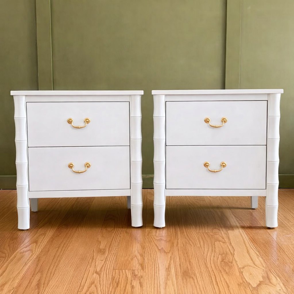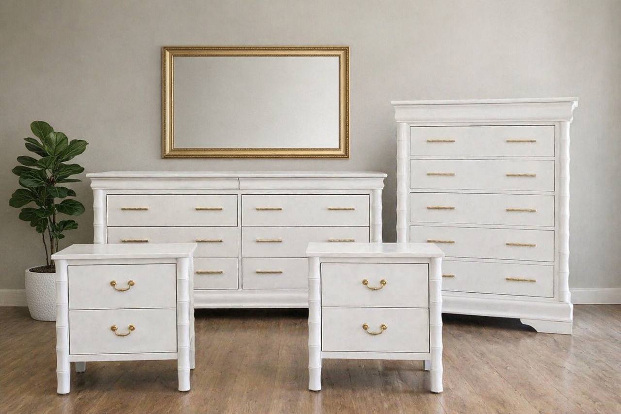 This elegant bedroom set features a clean white finish with subtle bamboo-inspired detailing and brushed gold hardware for a refined, upscale look. The dresser and chest offer a perfect balance of modern simplicity and organic texture, complemented by warm wood flooring and soft, neutral accents. Styled with natural greenery, warm lighting, and layered décor, this set brings a fresh, airy feel while maintaining a sophisticated, timeless presence. Perfect for creating a calm and inviting bedroom space.