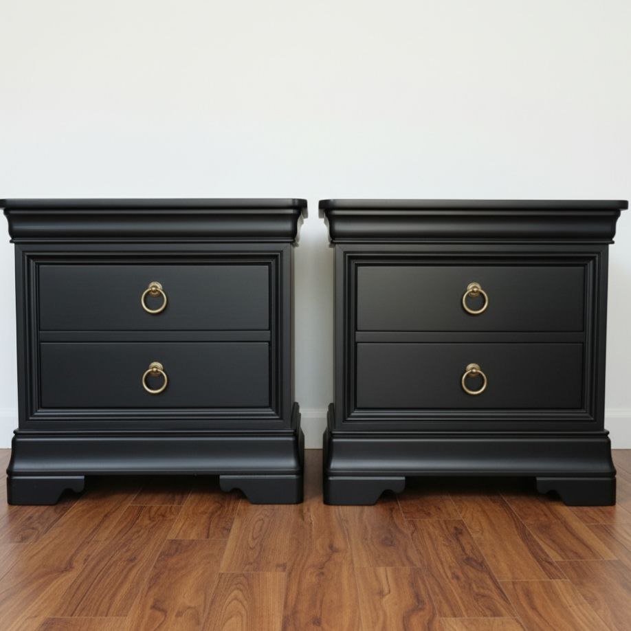 Bring classic elegance and functional storage to your bedroom with this matching set of two stately nightstands. Finished in a deep, matte black with striking brass ring hardware, they offer a timeless, high-end look that blends easily with traditional, transitional, or modern décor. Each piece features a generous top for lamps and essentials, plus two spacious drawers to keep your bedside neat and organized. Built with sturdy construction and a smooth, durable finish, these nightstands are perfect as bedside anchors or chic accent pieces.