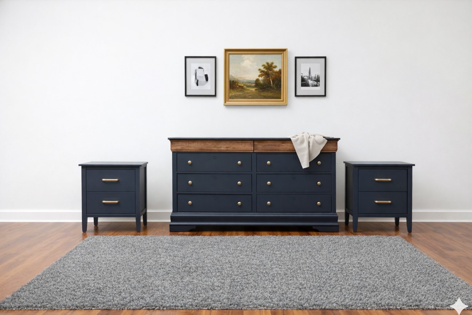 This beautifully refinished bedroom set blends boho and farmhouse styles, featuring contrasting natural wood accent drawers. The set includes: