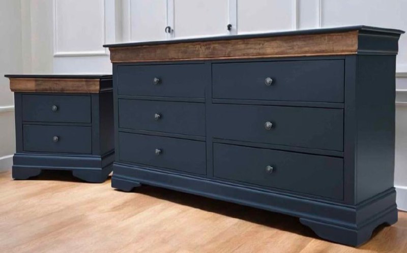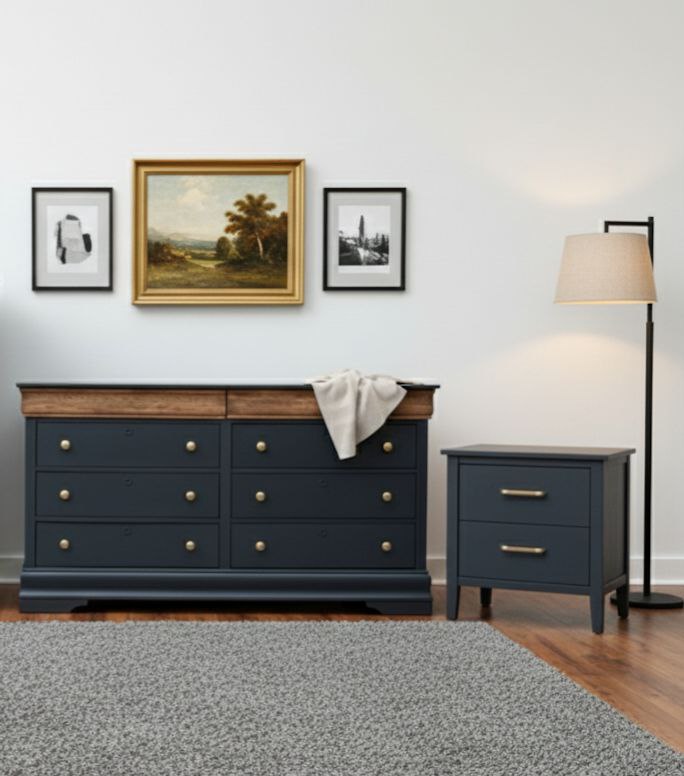 This beautifully refinished bedroom set blends boho and farmhouse styles, featuring contrasting natural wood accent drawers. The set includes: