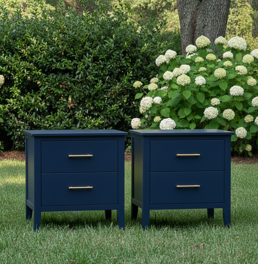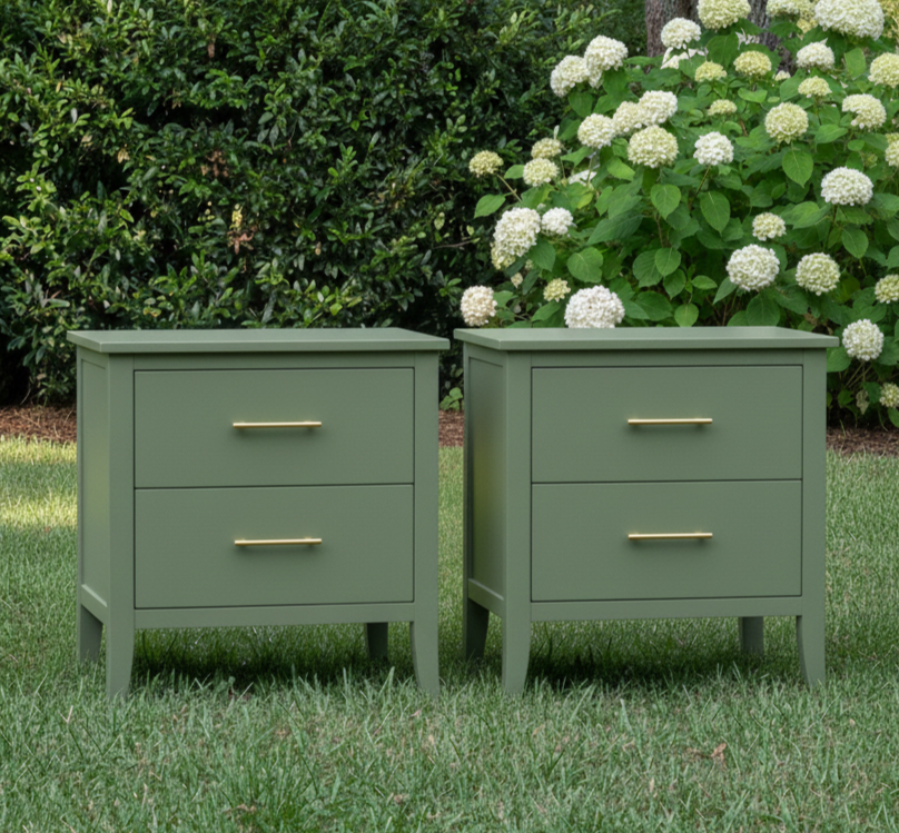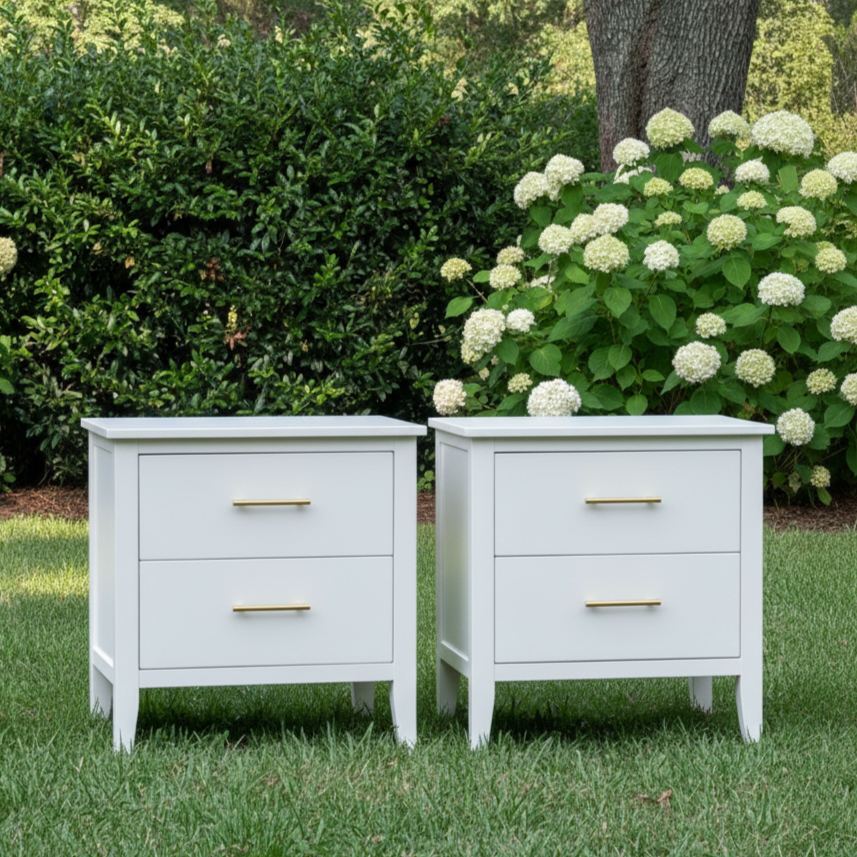 Set of two solid wood nightstands refinished in a smooth white.